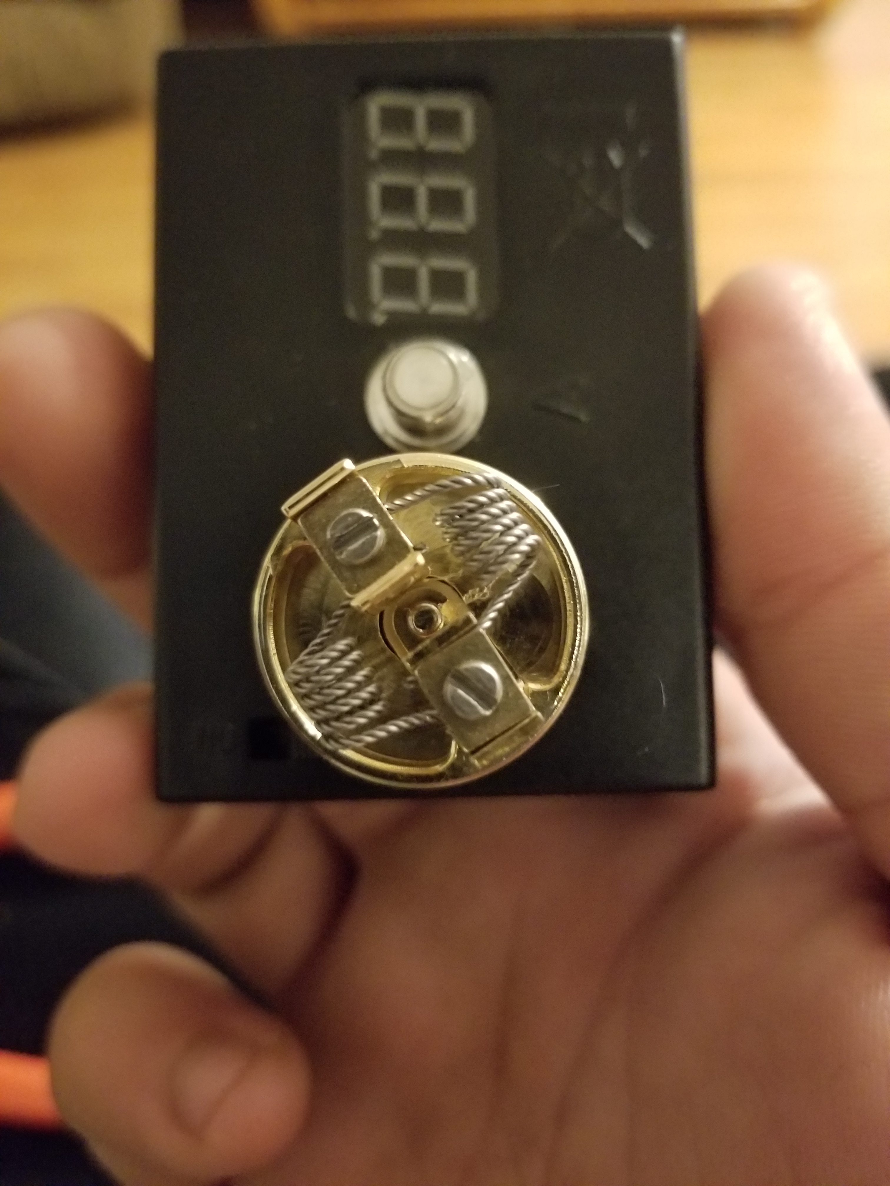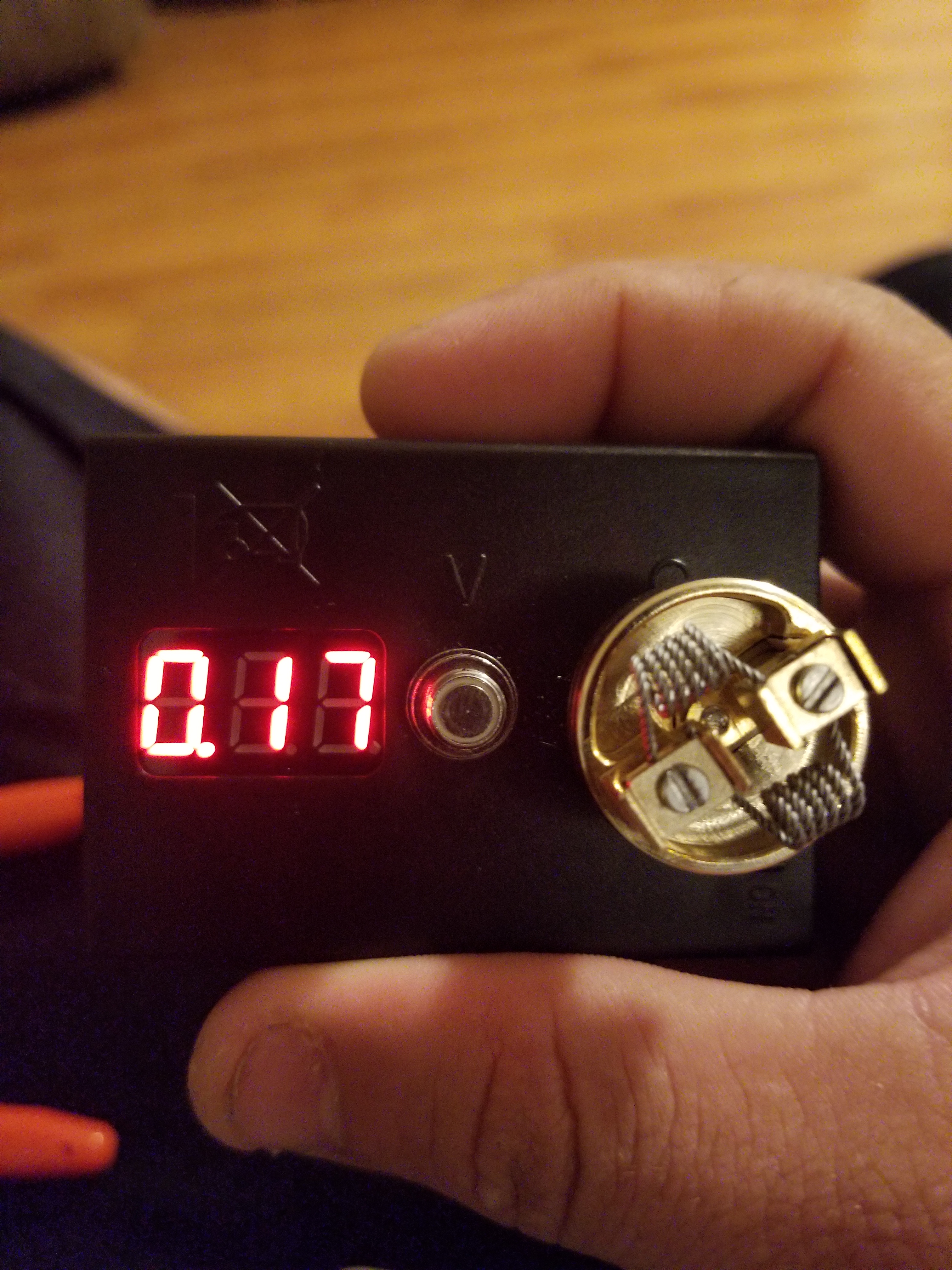 Wicked, juiced, and heating it up. I put the shield on because I was unbending the mouthpiece, which I bent earlier this week. By the way, the RDA is awesome but it bends easily. Thankfully, it only took about 20 seconds to fix it, and I didn’t even scratch the gold off! Pretty happy with it at 60 watts test fire, but upped the voltage to 100w for decent use. At 100w, it’s only drawing ~4.36 volts so I could almost push it to the full 150w that the Coolfire Ultra offers. I won’t, but I could.
