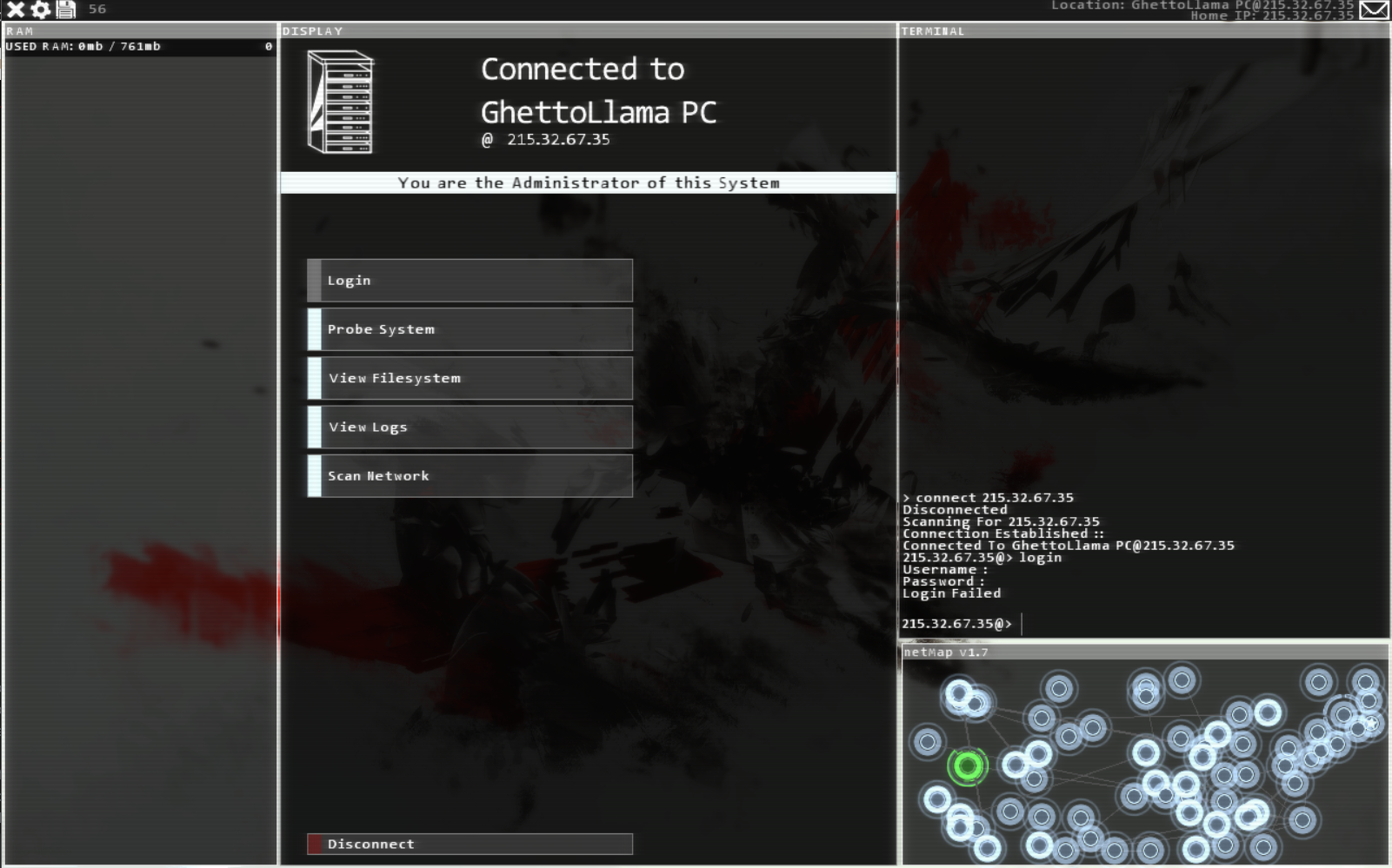 As seen above, I’m connected to my own in-game PC. It looks rather boring, and is on the surface. As the caption says, you have running tasks (left,) UI (center,) terminal (top-right,) and network with discovered nodes (bottom-right.) This is the only interface with the game, so no people or walking around. Just a basic interface, where you can type in commands, and click your way through various menus and challenges.