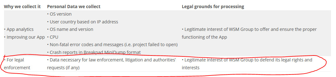 There’s also some information on storing IP addresses, where the IP will be stored in an identifiable way for a calendar day, then stored as a hash. The hash will be stored for one year, then deleted. Other information collected, OS version and CPU information, is not identifiable. They may also store your personal data for their own legal rights.